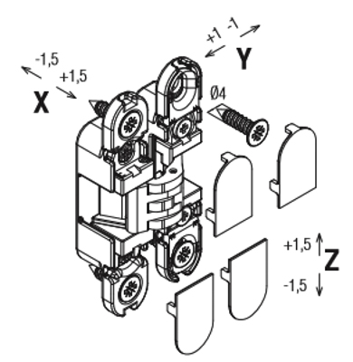 - регулируются в 3-х плоскостях, все регулировки независимые (горизонтальная +/-1.5 мм, вертикальная +/-1.5 мм, в глубину +/- 1,0 мм)