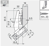 В комплект входят петля CLIP top BLUMOTION, крестообразная ответная планка CLIP с подъемом 6 мм и регулировкой эксцентриком, подкладка клинообразная -5° с подъемом 6 мм