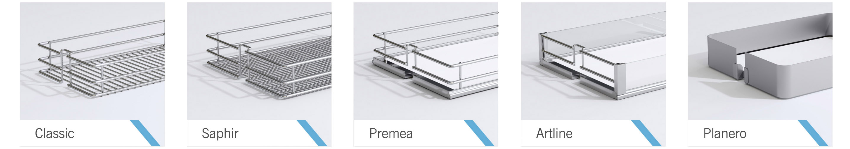 - Saphir (Сапфир) — стальная сетка с четырехслойным хромированным покрытием. Дно состоит из многочисленных пересечений прутов, каждое из которых усилено точечной сваркой. Технология запатентована. За счет неё конструкция имеет высокую жесткость и стабильность. Подходит для хранения даже мелких предметов;