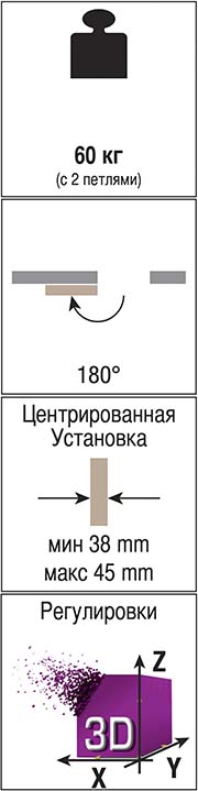 Петля имеет мягкий ход, стабильный шарнир с семью осями вращения и возможностью регулировки в трех плоскостях. Все регулировки независимые: горизонтальная +/−1 мм, вертикальная +/−3 мм, в глубину +/−1 мм. Оптимальная нагрузка на две петли — 60 кг, угол открывания до 180°, толщина дверного полотна от 38 мм до 45 мм.